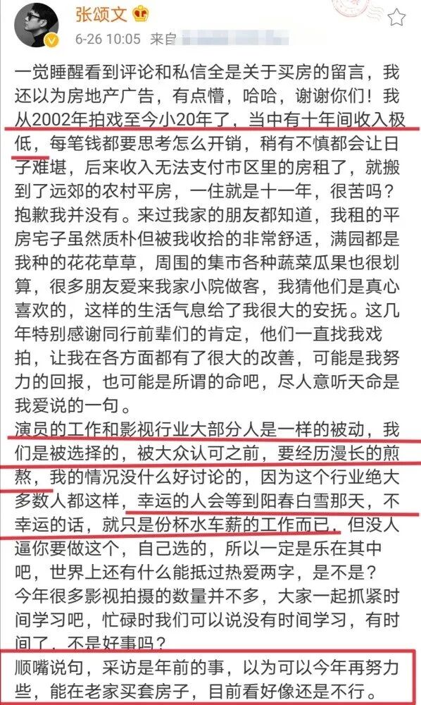 张颂文还指出了残酷的事实:他的情况,就是全中国99.5%演员的情况,只有那0.5%的演员,才能够真正的“衣食无忧”。