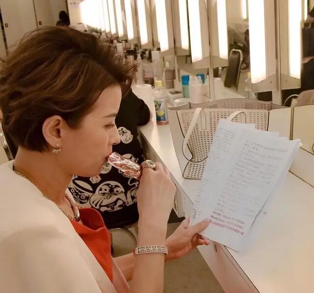 照片中,黎燕珊略显疲态,妆容也有些花了,但她依旧坚持一边补充营养液,一边看台词。