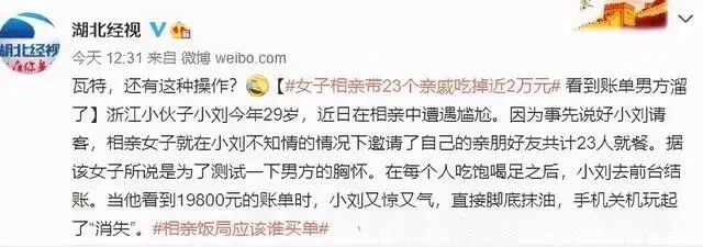 原本相亲过程还算和谐,但当大家吃饱喝足,小刘前去结账时,才惊讶地发现当场消费金额高达19800元。
