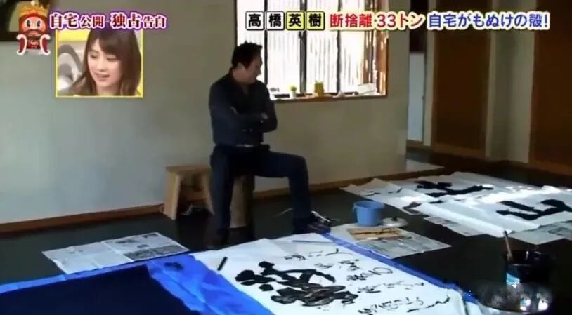 闲来无事时,高桥英树在地板上铺好字帖,在家就能尽情挥洒笔墨。
