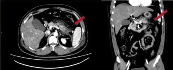 腹部增强CT提示胰腺尾部肿胀,胰腺周围脂肪间隙模糊,多发斑片状。