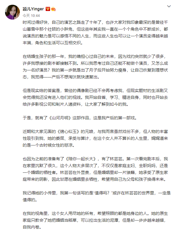 最近,颖儿在社交平台发表了一段长文,回顾了自己十几年的成长。