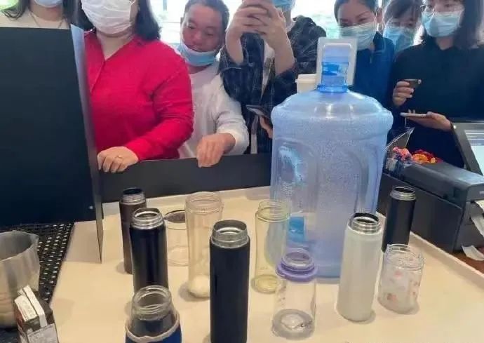 当天,许多门店可以说是人山人海,因为没有规定自带水杯的品牌,现场各式各样的杯子都有。