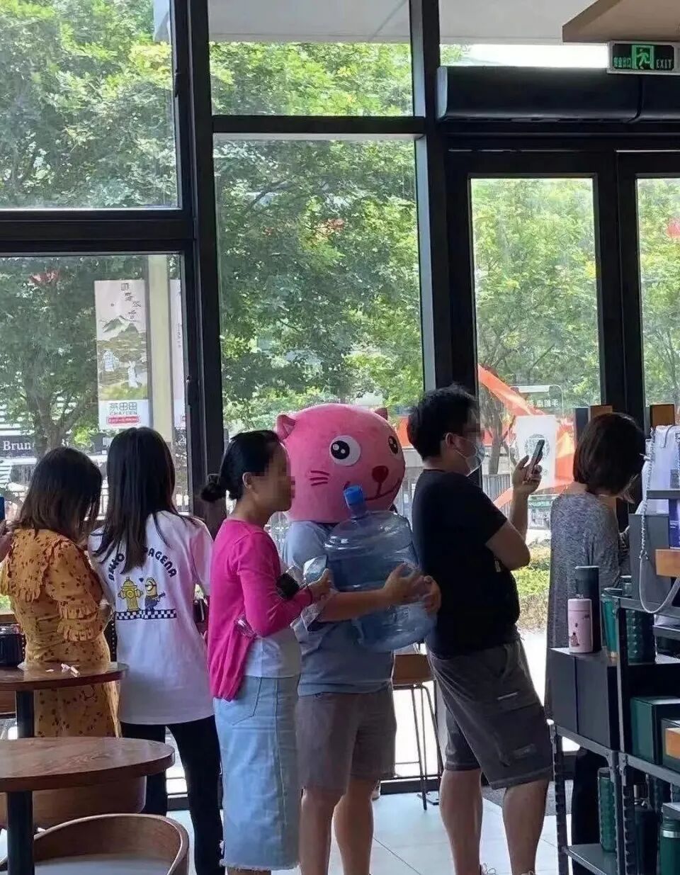 大概提桶人也能想象周围人异样的眼光,索性带着头套,避免露脸。