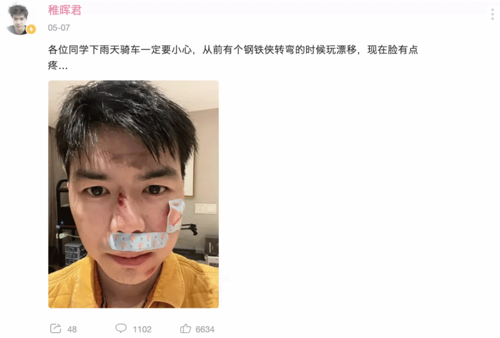 事情要追溯到稚辉君的一次意外跌倒。一次下雨天,他骑车外出,结果狠狠摔了一跤。