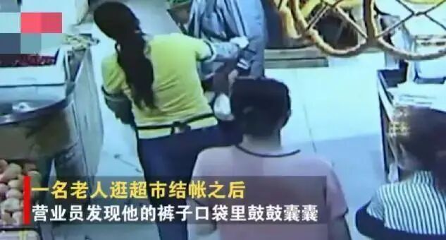结账完准备离开时,超市工作人员发现大爷裤袋中鼓鼓的,似有东西,便拦下了他。