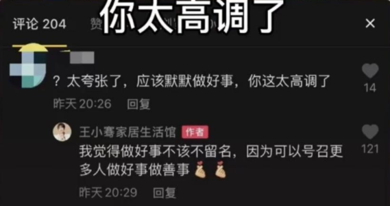 有网友直接在社交平台上留言:“应该默默做好事,你这太高调了。”