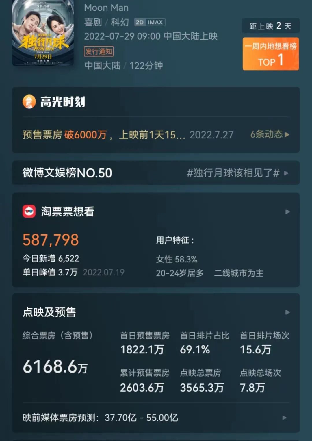 《独行月球》还未上映,预售票房已经破亿,总票房预测37亿。