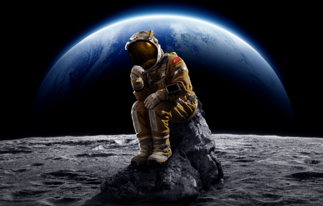 在他的背后,是美丽的地球,看似触手可及,实则相隔不止万里。