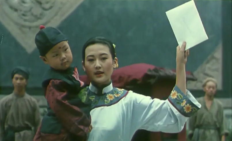 影片结尾,么姑坐上红轿子,抱着儿子来到了衙门,手里拿着告书,要求放了自己的丈夫。