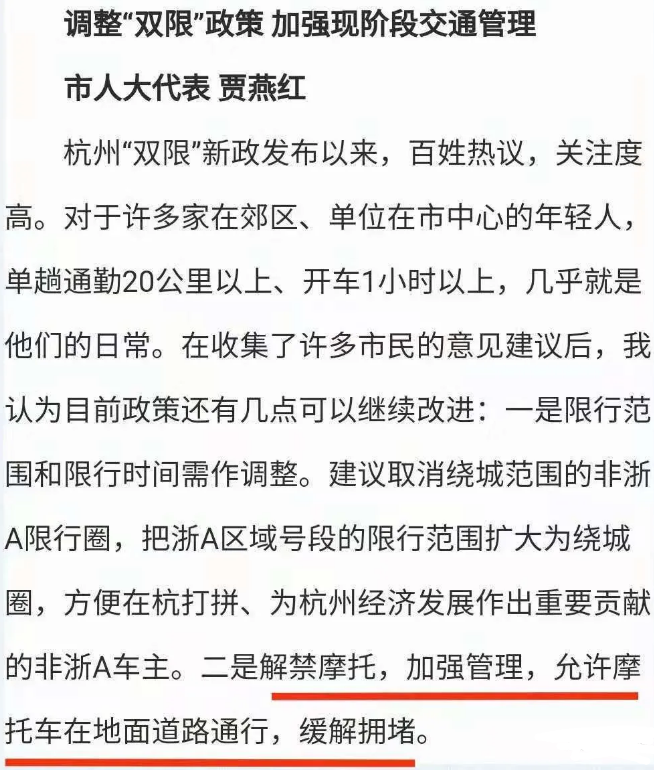 对此有几点可以改进意见:1、一是限行范围和限行时间需作调整,建议取消绕城范围的非浙A限行圈,把浙A区域号段的限行范围扩大为绕城圈,方便在杭打拼、为杭州经济发展作出重要贡献的非浙A车主。2、是解禁摩托车,加强管理,允许摩托车在地面道路通行,缓解拥堵。