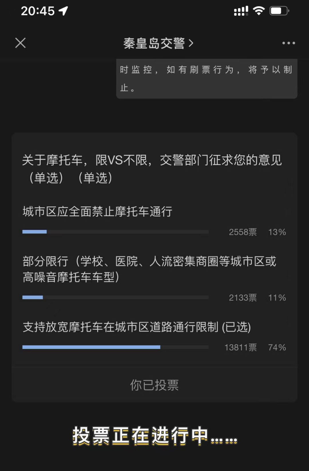 特别提醒:秦皇岛交警不委托任何第三方对投票活动进行运营,如遇到承诺帮助刷票等情况,请谨慎处理,自觉抵制。系统后台对投票数据进行实时监控,如有刷票行为,将予以制止。