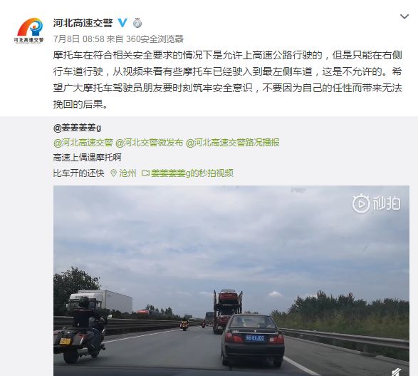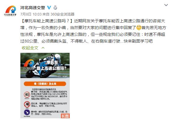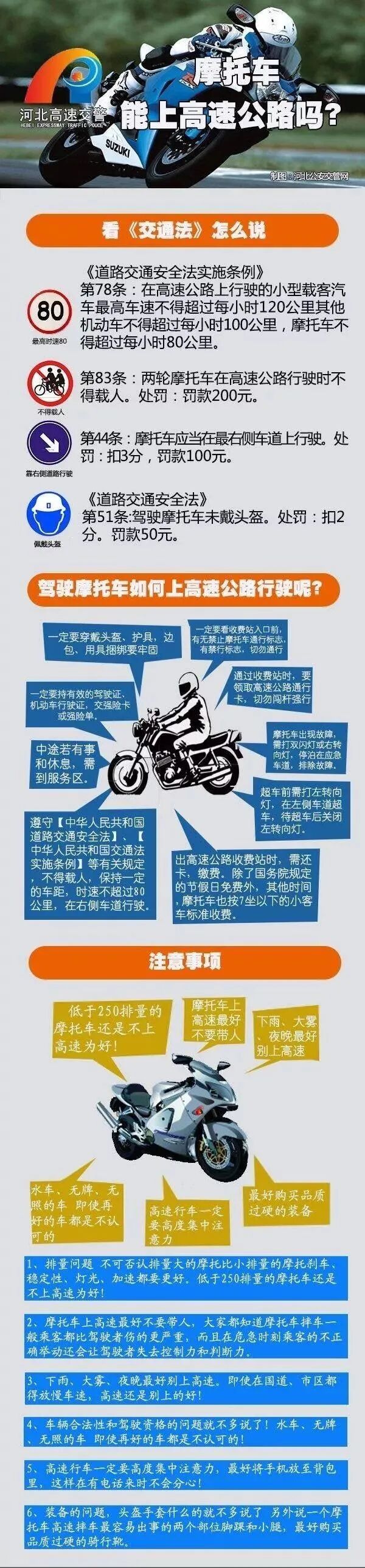 近日,河北省高速交警通过官方微博发文:摩托车在符合相关安全要求的情况下是允许上高速公路的,并强调一些规定需要遵守。