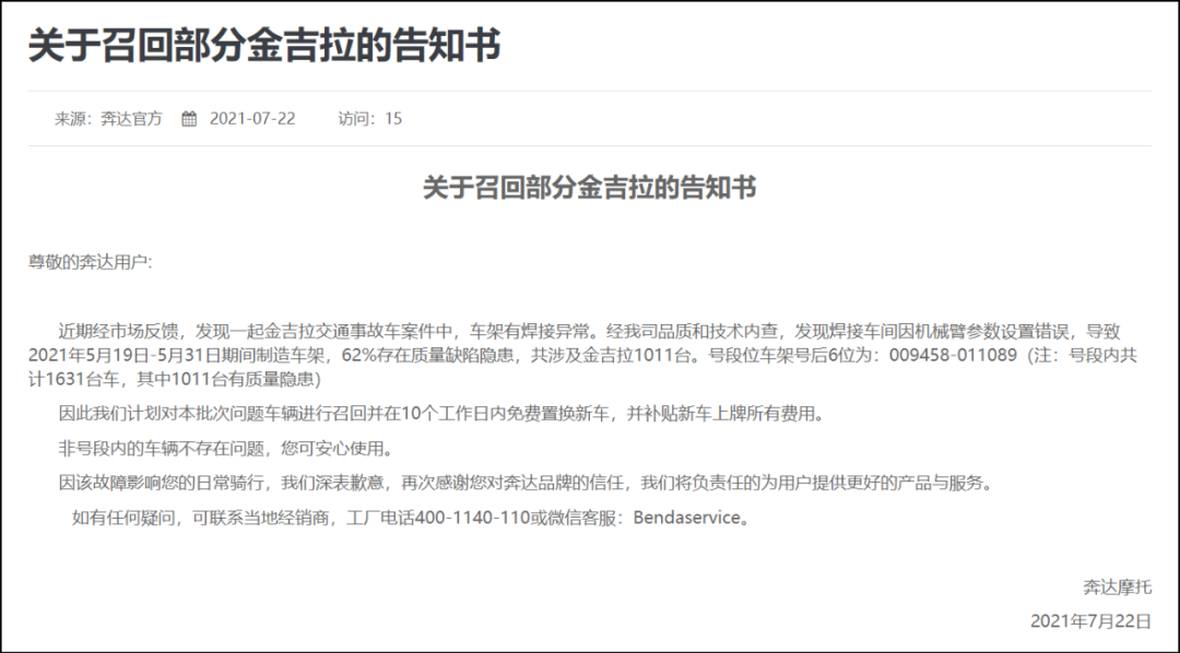 今天,奔达官方发布了一则召回信息,表示由于机械臂参数设置错误,确认了部分批次金吉拉300存在质量缺陷,确有安全隐患存在,其中涉及质量缺陷的车辆共计有1011台。