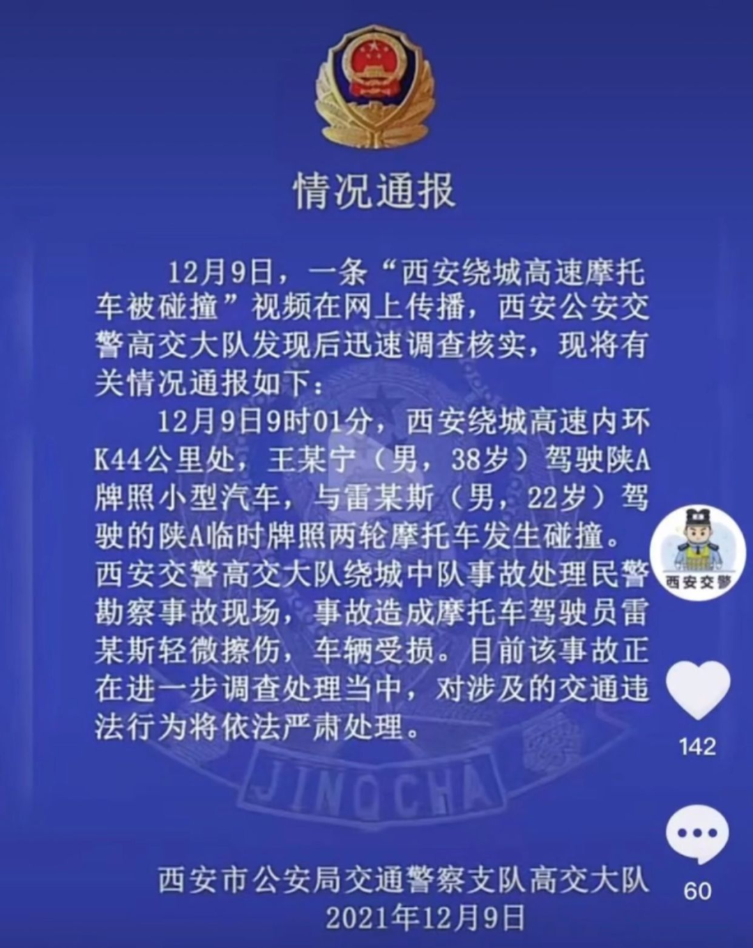 西安警方随后通报:9日9时01分,王某宁驾驶小型汽车与雷某斯驾驶的摩托车发生碰撞,事故造成摩托车驾驶员轻微擦伤,车辆受损。