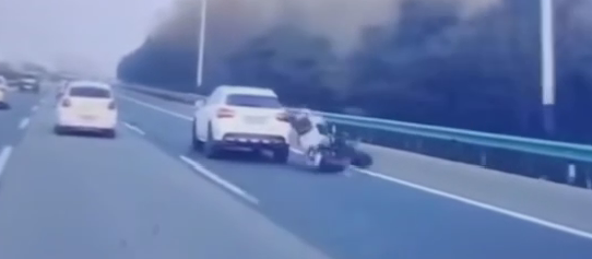 视频前半段:奔驰GLA原本在二车道,随后超过油罐车变道,又继续开了一段路便撞上最右边的摩托车,摩托车司机连人带车直接翻滚在地。