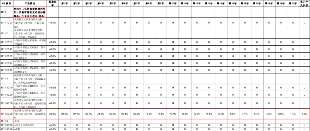 在协定附件的关税承诺表中,中国对日本关税承诺表(中国进口日本产品)显示,摩托车整车进口500cc以下关税仍然为45%,500cc-800cc为40%,800cc以上为30%。仅排量在800cc以上的摩托车逐年递减税率,21年以后才到0关税。