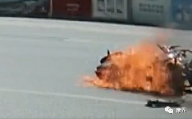 摩托车倒下的瞬间燃起熊熊大火,现场让人触目惊心。