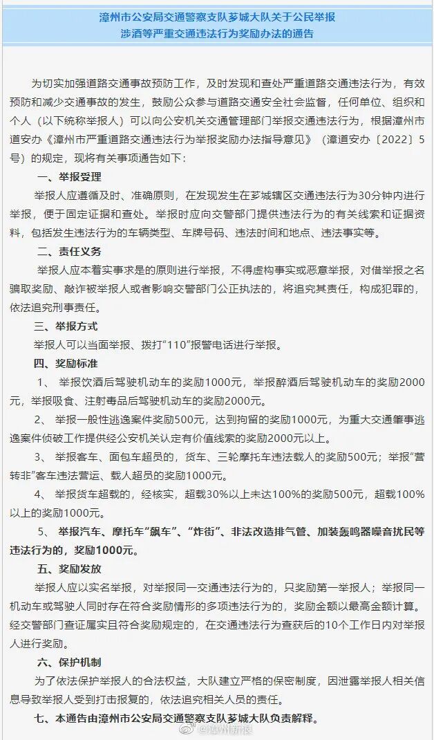 近日一则悬赏信息,让不少车友感受到了很强的吸引力,这就是福建漳州交警发布的悬赏令:鼓励公众参与道路交通安全社会监督,任何单位、组织和个人可以向公安机关交通管理部门举报交通违法行为。