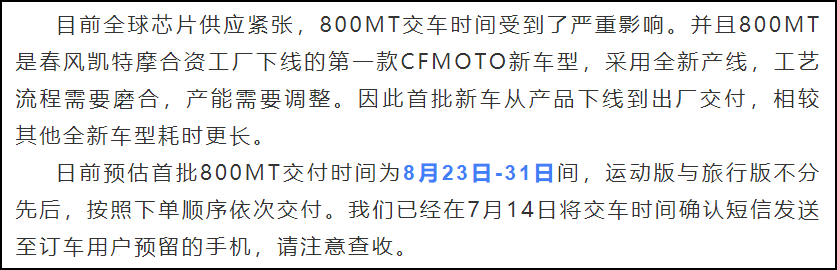 目前春风给出的是MT800由于芯片短缺和产能,车辆将会延迟交付,首批交付日期要在下个月底,订单状态都是待排产状态,还有大阳的ADV350因为博世ABS芯片问题,推出了一款赛福ABS版车型来做替补。