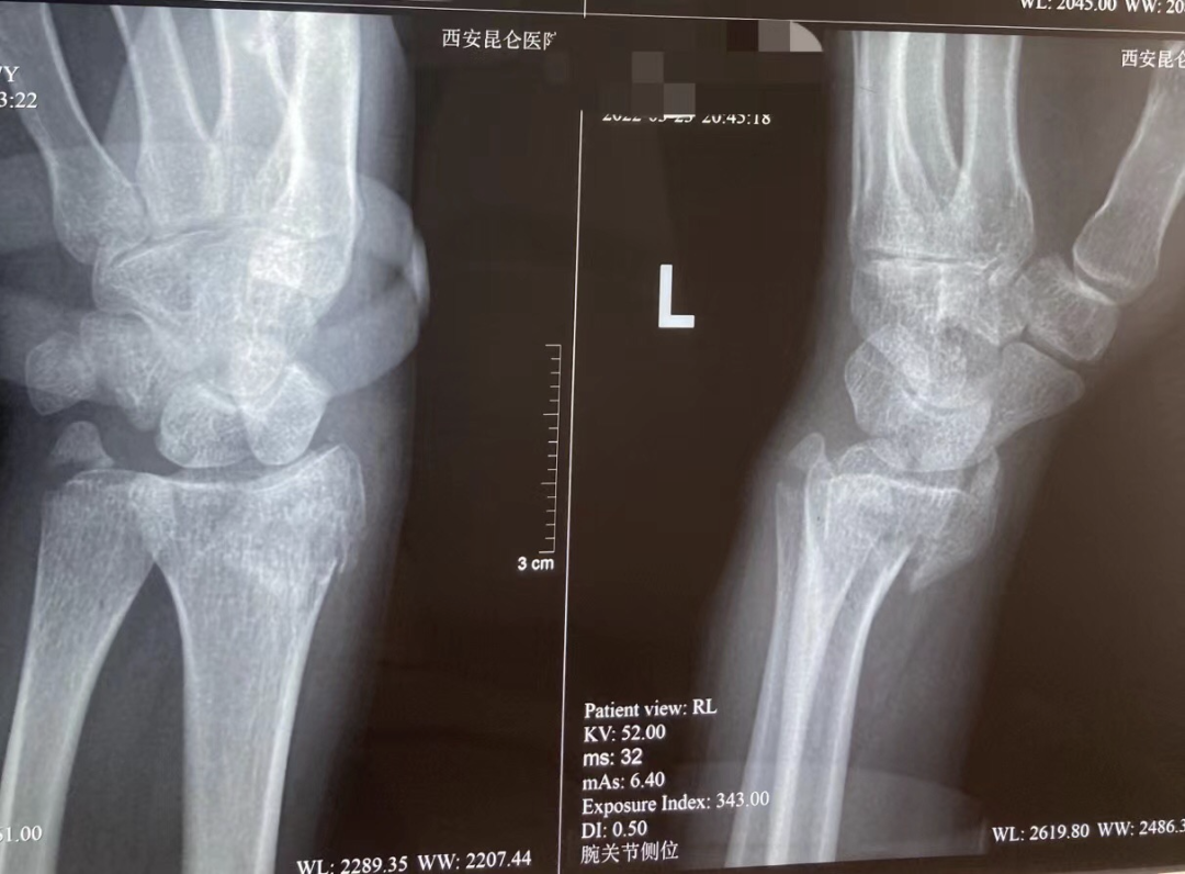 被撞倒的后座女乘客,经拍片后确认为左手骨折。