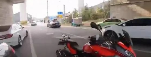 但是当奔驰车行驶到一半的时候,正向来了一辆宝马摩托车,双方狭路相逢,堵上了!