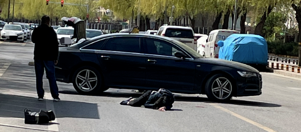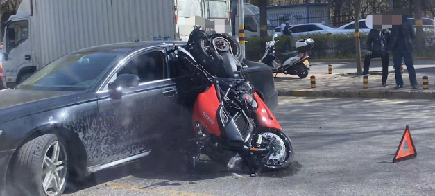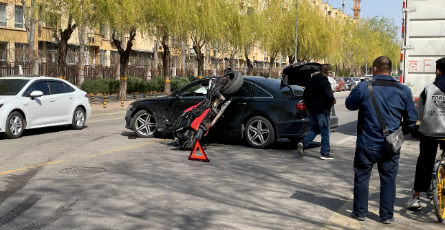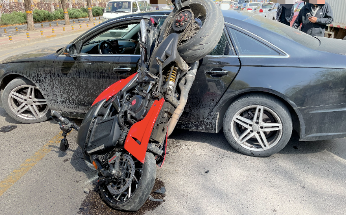 昨天(4月6日)下午2点左右,在龙腾街附近发生一起惨烈的交通事故:一辆摩托车撞上正在掉头的小汽车后,摩托车直接倒挂在小汽车上,摩托车手被撞飞好远,地面有血迹……