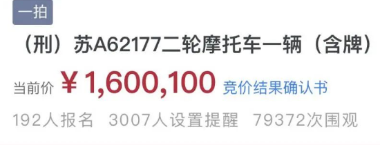 这是一辆没有车钥匙且无法启动的摩托车,年检已过临近报废期,却有几百人报名来"抢"它。4月18日,在阿里拍卖平台,这辆起拍价只有2100元的摩托车,最终的成交价为160.01万元,吴某某以该价格胜出。...更多详情>>