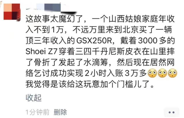 这是事情的全部经过,这段时间有表示同情并捐款的,有蹭热点以达到个人目的的,我想说的是骑摩托车管好你自己的右手,别逞能去山里压弯,你可以赢弯道很多次,弯道只赢你一次就够了。