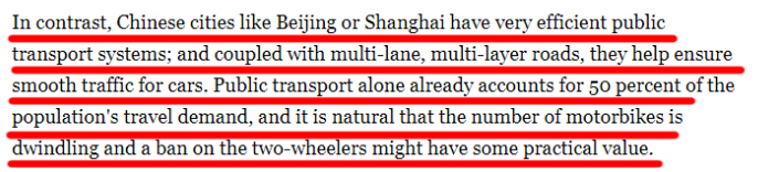 相比之下,像北京或上海这样的中国城市拥有非常高效的公共交通系统;再加上多车道、多层次的道路,它们有助于确保汽车的顺利通行。仅仅是公共交通就已经占到了人口出行需求的50%,摩托车的数量自然也在减少,禁止两轮车可能有一些实际价值。