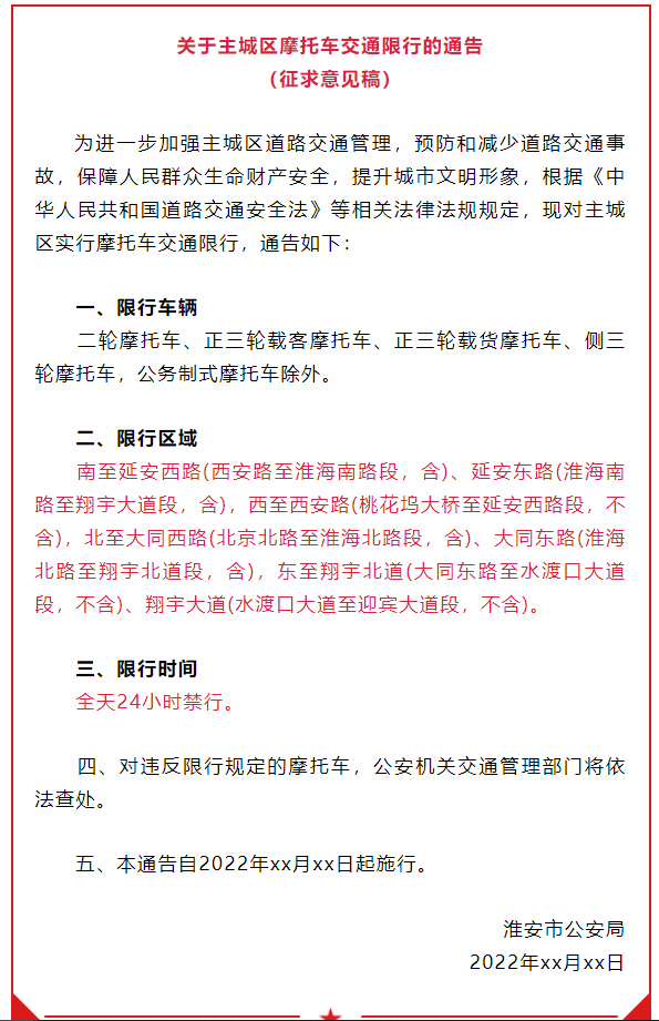 为进一步加强主城区道路交通管理,预防和减少道路交通事故,保障人民群众生命财产安全,提升城市文明形象,根据《中华人民共和国道路交通安全法》等相关法律法规规定,淮安市公安局起草了《关于主城区摩托车交通限行的通告(征求意见稿)》,现向社会公开征求意见。意见反馈截止日期为2022年5月13日。公众可以通过以下途径和方式提出意见: