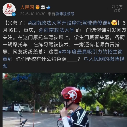 近日,西南政法大学的摩托车选修课走红,引起了《人民日报》、《北京青年报》在内的多家媒体的竞相报道。