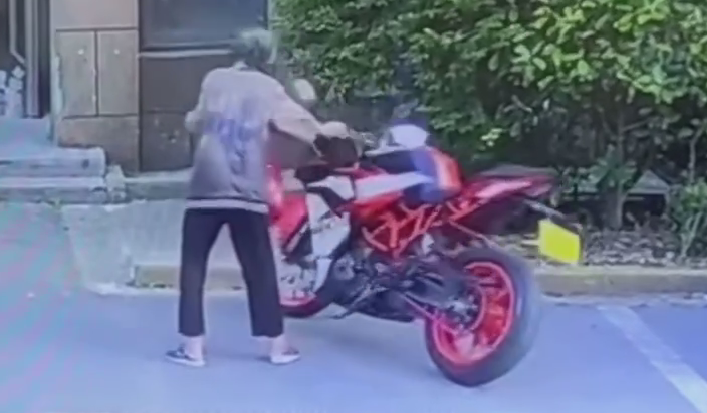 这是一段6月25日的监控视频,视频中的一位走路都颤颤巍巍的老太太,正在努力靠近一辆停在门口的KTM390摩托车。