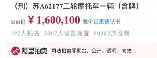 2022年7月10日,南京市栖霞区人民法院发布了一则司法拍卖的最新情况通报,吴某以160万元的价格,竞拍下了一辆起拍价为2100元,已经不能启动且即将强制报废的摩托车。2022年4月17日,在南京市栖霞区人民法院的主持下,一辆带苏a牌照的黑色本菱HL250T-C摩托车,带有一块南京市区牌照,在网络上进行司法拍卖。....更多详情>>