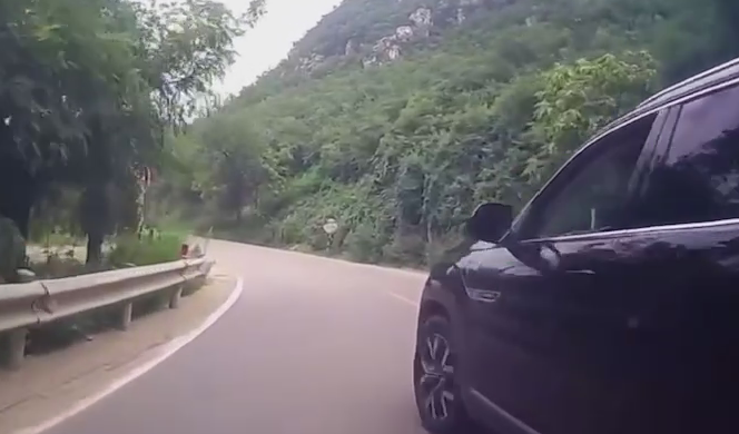近日在一段山路上,一辆正在行驶的摩托车,遇到一辆大众汽车越线借道超车,差点发生相撞,骑手给了大众汽车比了一个中指,然后就正常走了。