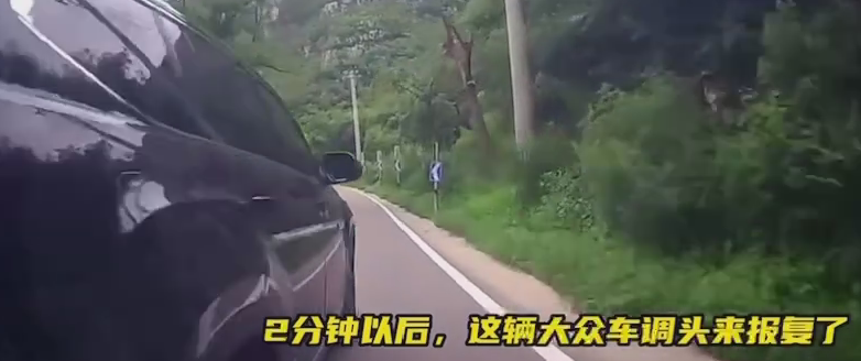 过了大约两分钟,这辆大众汽车调头追上了摩托车,并把摩托车别停,差点撞上。