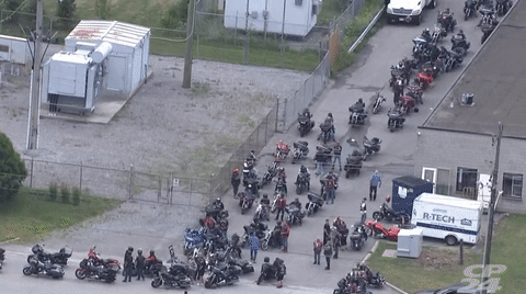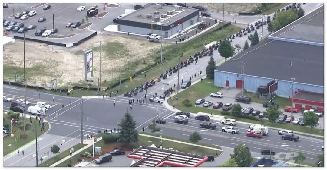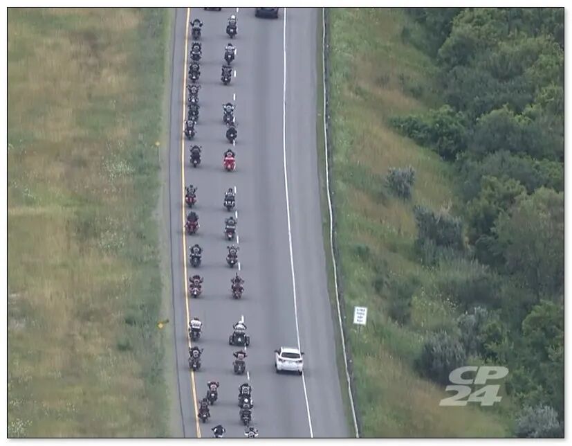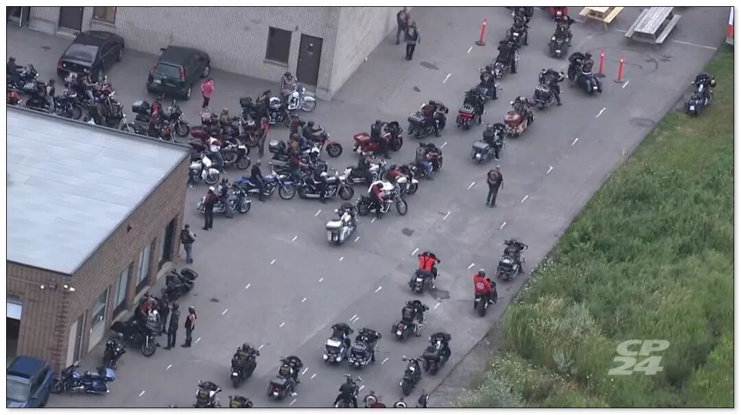 CP24从10点开始直升机跟踪直播:集结的地狱天使车队,正准备出发,约有1260名成员。