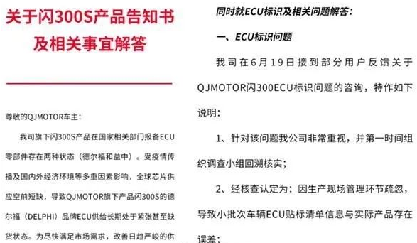 随后,钱江摩托在其公众号上发布《关于闪300S产品告知书及相关事宜解答》(以下简称《解答》),《解答》称,经核查认定:因生产现场管理环节疏忽,导致小批车辆ECU贴标清单信息与实际产品存在误差。