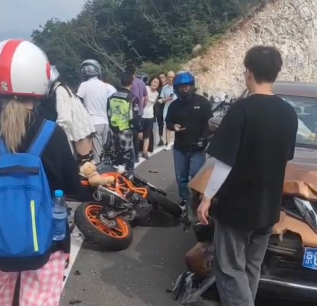 北京门头沟双大路一个急弯处发生了交通事故,一辆KTM390摩托车在压弯时失控,冲入逆向车道,与一辆正常行驶的日产轿车迎面相撞,不巧的是,此处弯道的外侧正好是一个几十米深的悬崖,两车相撞后,骑车的男子从身上摔下,越过了弯道外侧的水泥护栏,不幸坠下了悬崖。