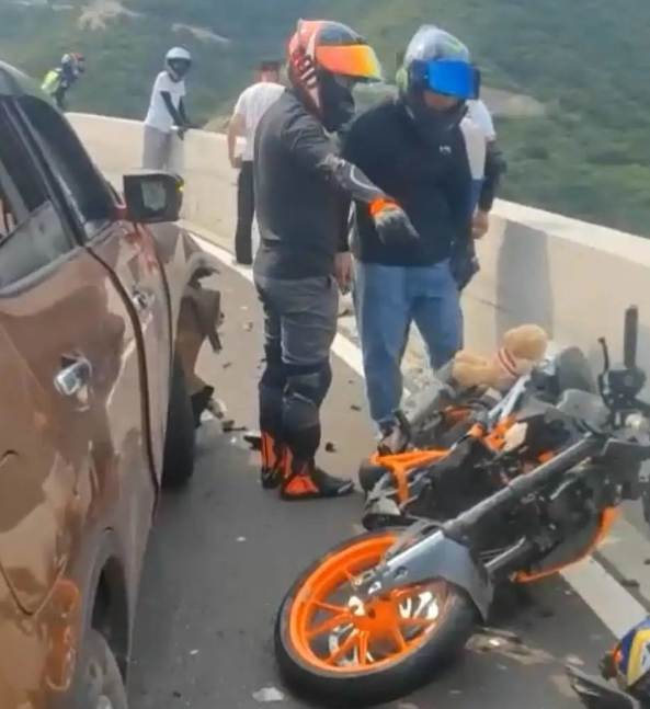 无独有偶,同样是在这个弯道处,前几天一名女骑士压弯时也是因为压弯失败,摩托车冲入了逆向车道并且与水泥护栏发生了相撞,骑车的女子翻过护栏,摔到了护栏外面。