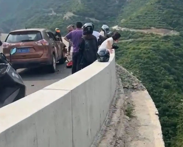 事故发生后,队友连忙停车过去查看女骑士的情况,万幸的是,女骑士摔车的护栏外面是一个小平台,所以有惊无险,人没有掉下悬崖,如果撞车的位置再靠后一些,女骑士就没这么幸运了,同样会坠下几十米深的悬崖。女骑士的队友感叹:这个弯太急了!