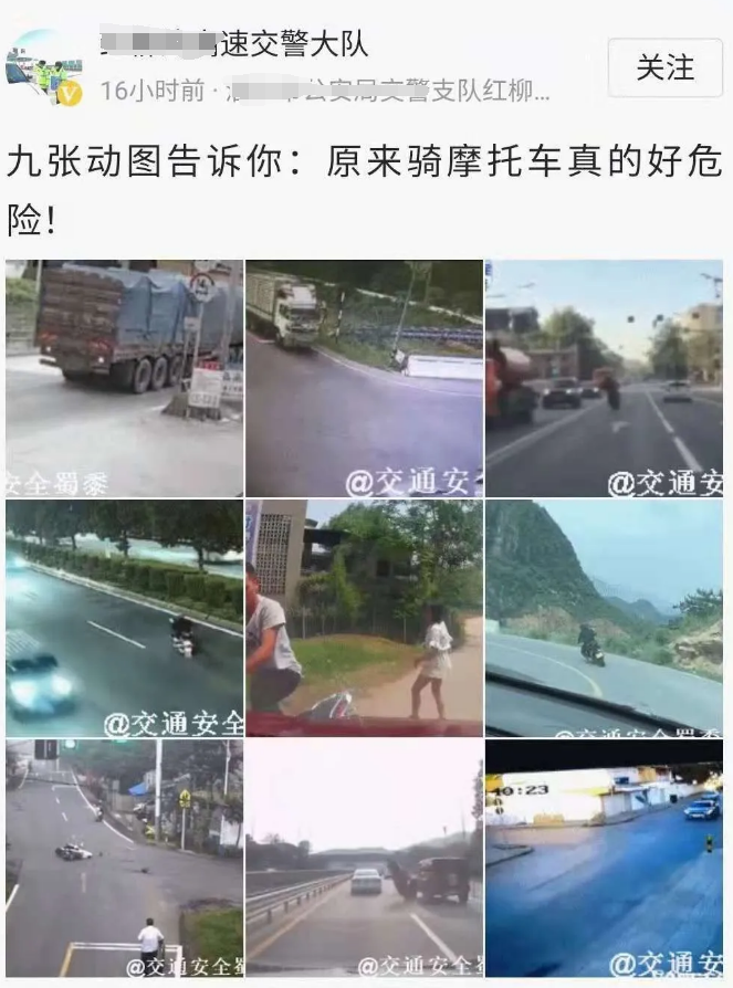 近日某官方账号于7月23日发布了《九张动图告诉你:原来骑摩托车真的好危险!》