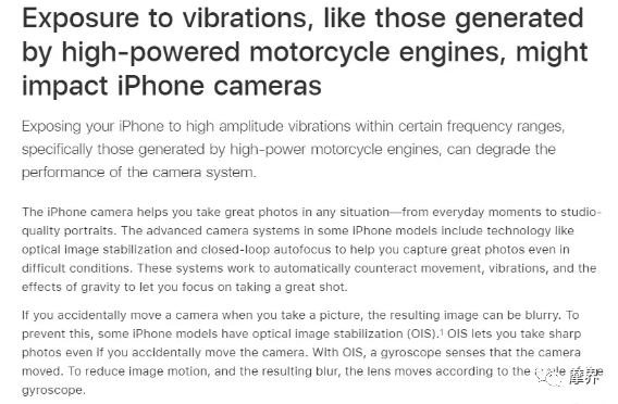 苹果的相关文件中显示,iPhone用户的手机摄像头可能会因暴露在某些振动频率(如大排量摩托车发动机)下而损坏。