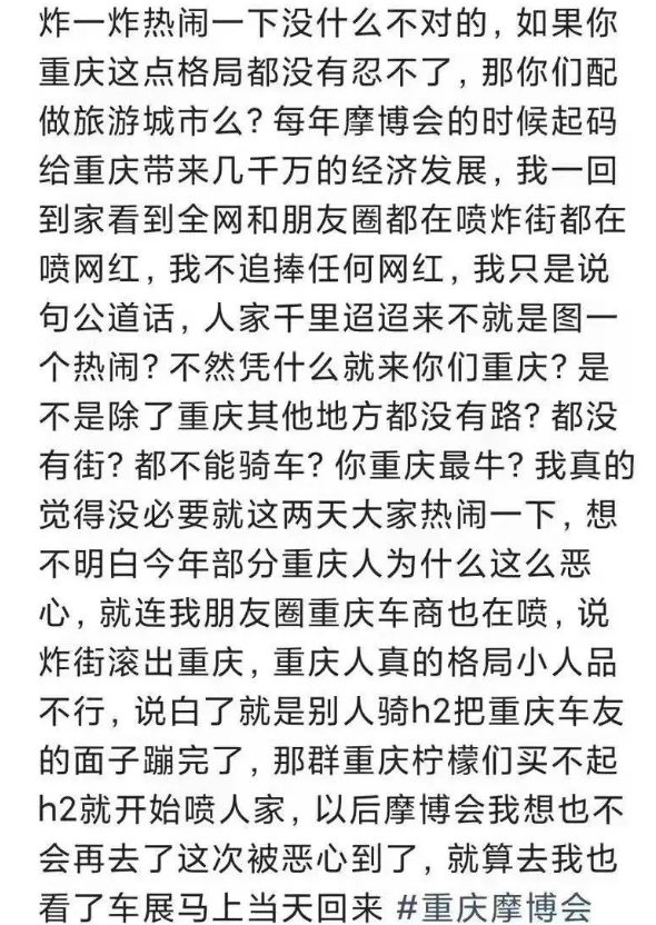 今年的摩博会也不例外,来举办地的重庆网友已经忍不住吐槽,说自己去年就被这些表演型人格的车辆追尾了,今年骑车出来简直步步惊心。