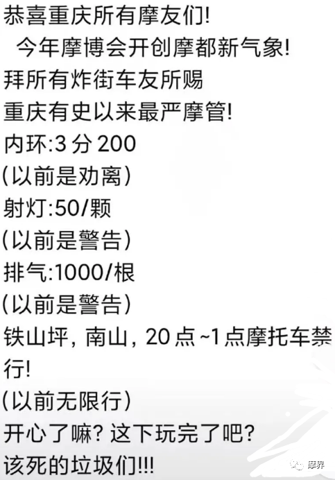 在摩博会结束之后,重庆摩友反馈重庆各项交通管理纷纷开启“史上最严”模式,以前禁摩的内环,由劝离升级成直接扣3分200元的处罚,加装排气和射灯的处罚标准也变得更加严苛。
