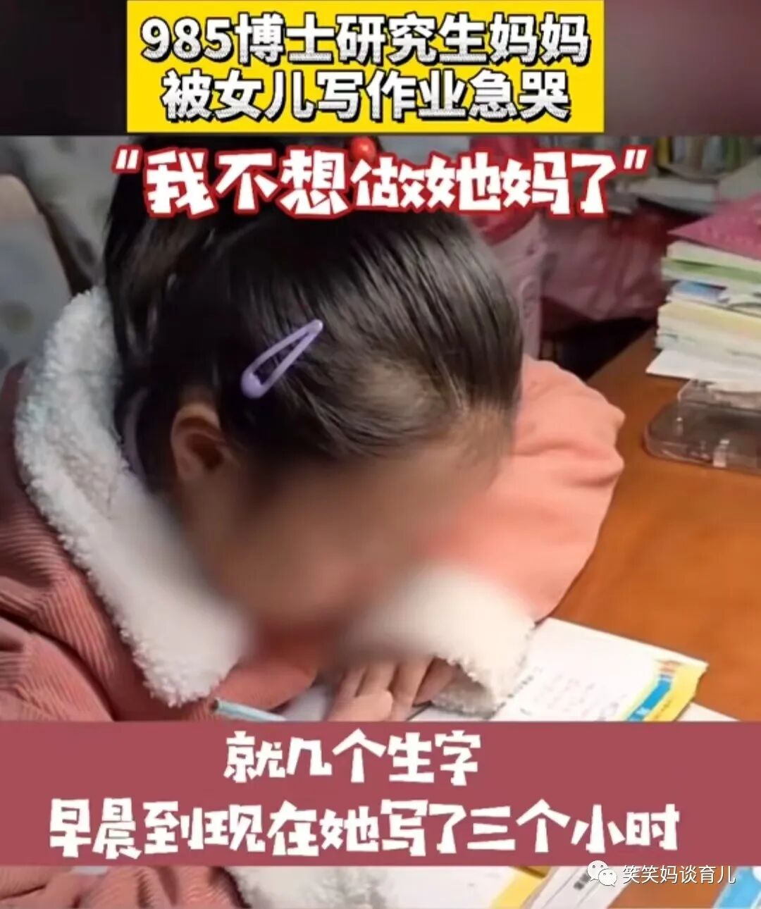 这个妈妈是985博士研究生,辅导女儿写作业,几个生字,从早晨开始写,写了3个小时,还在写,最后被女儿写作业急哭,说:“我不想做她妈了,我也想控制我自己,我也不想骂她”。