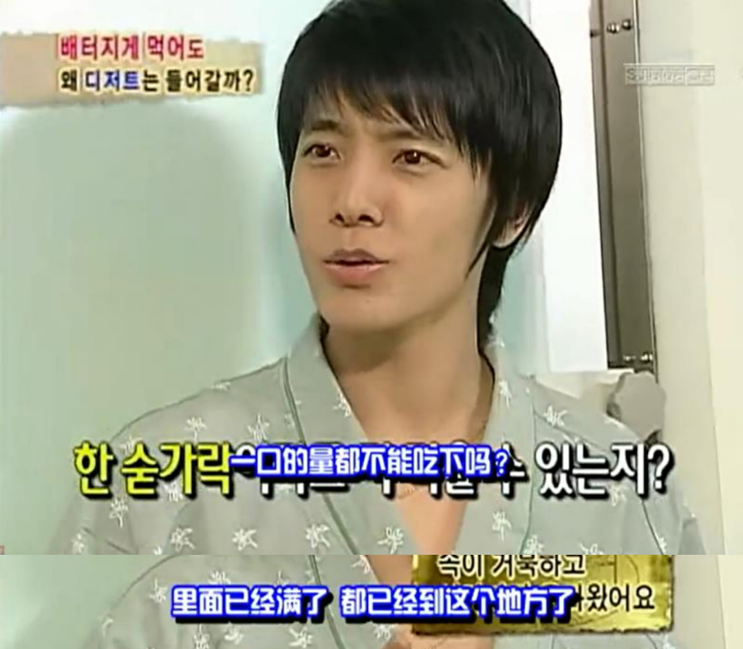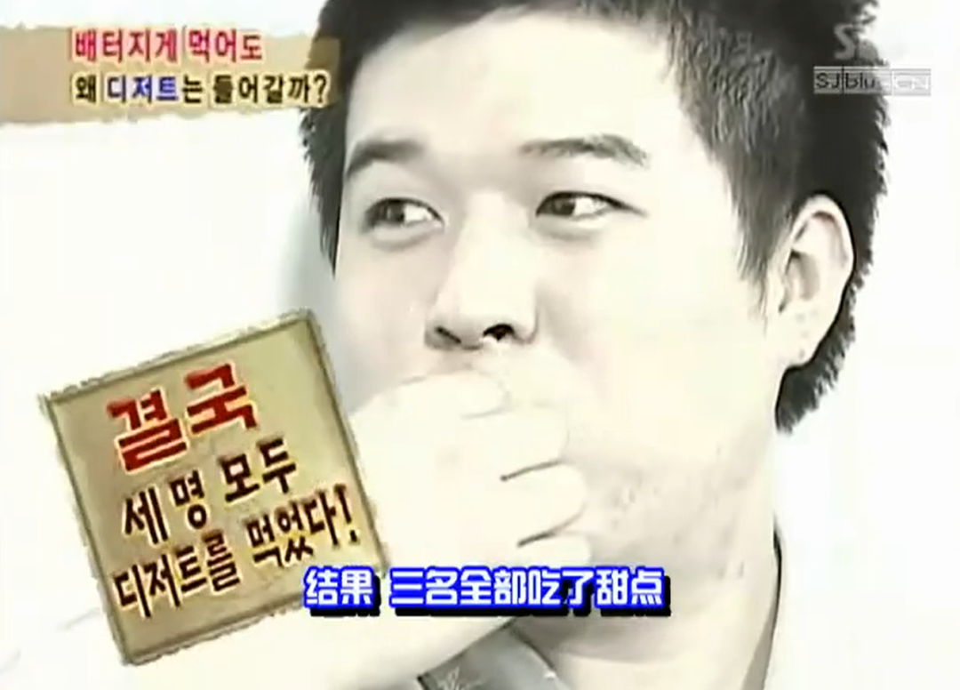 李东海并不是个例,后续的晟敏、神童虽说一个比一个吃得多(神童最终以1600多克的食物结束战斗),但二人也无一例外地在撑得要吐的前提下,都向甜点妥协了。