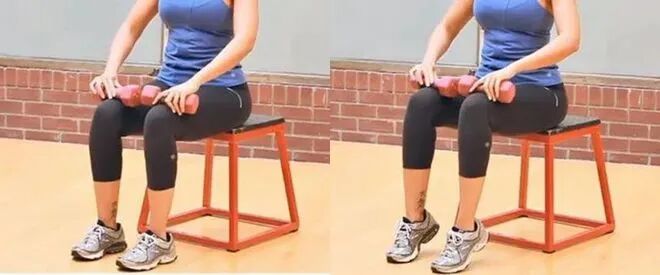 1、坐在椅子前缘1/3处,双腿上各放等重哑铃。