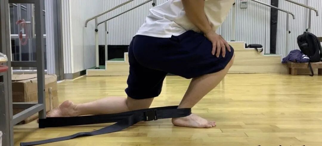 2、向前顶膝盖,利用带子的反作用力将距骨后移,保持1~2min。