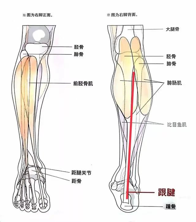 这部分跟腱没有肌肉的覆盖,就露出了跟腱原本纤细的样子,也就是我们俗称的脚脖子。